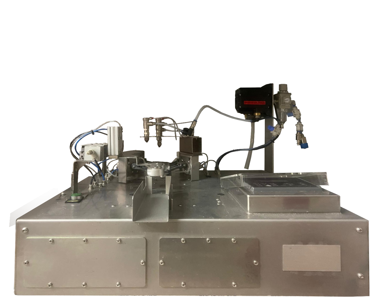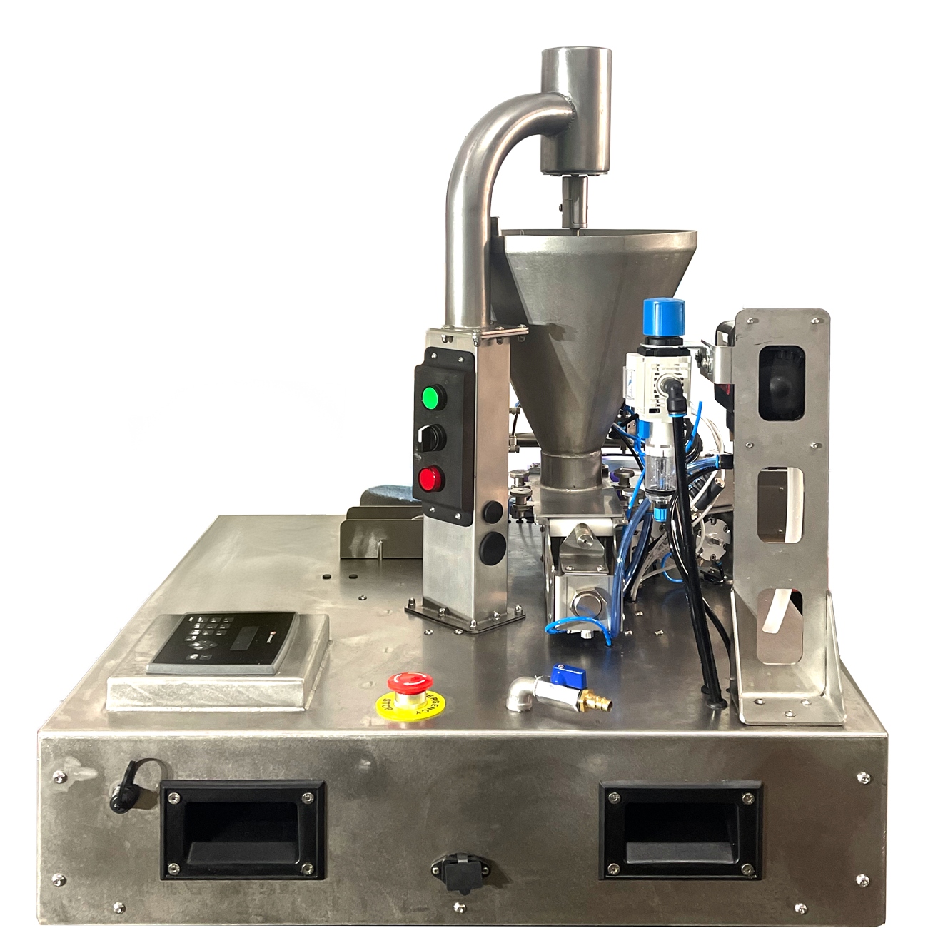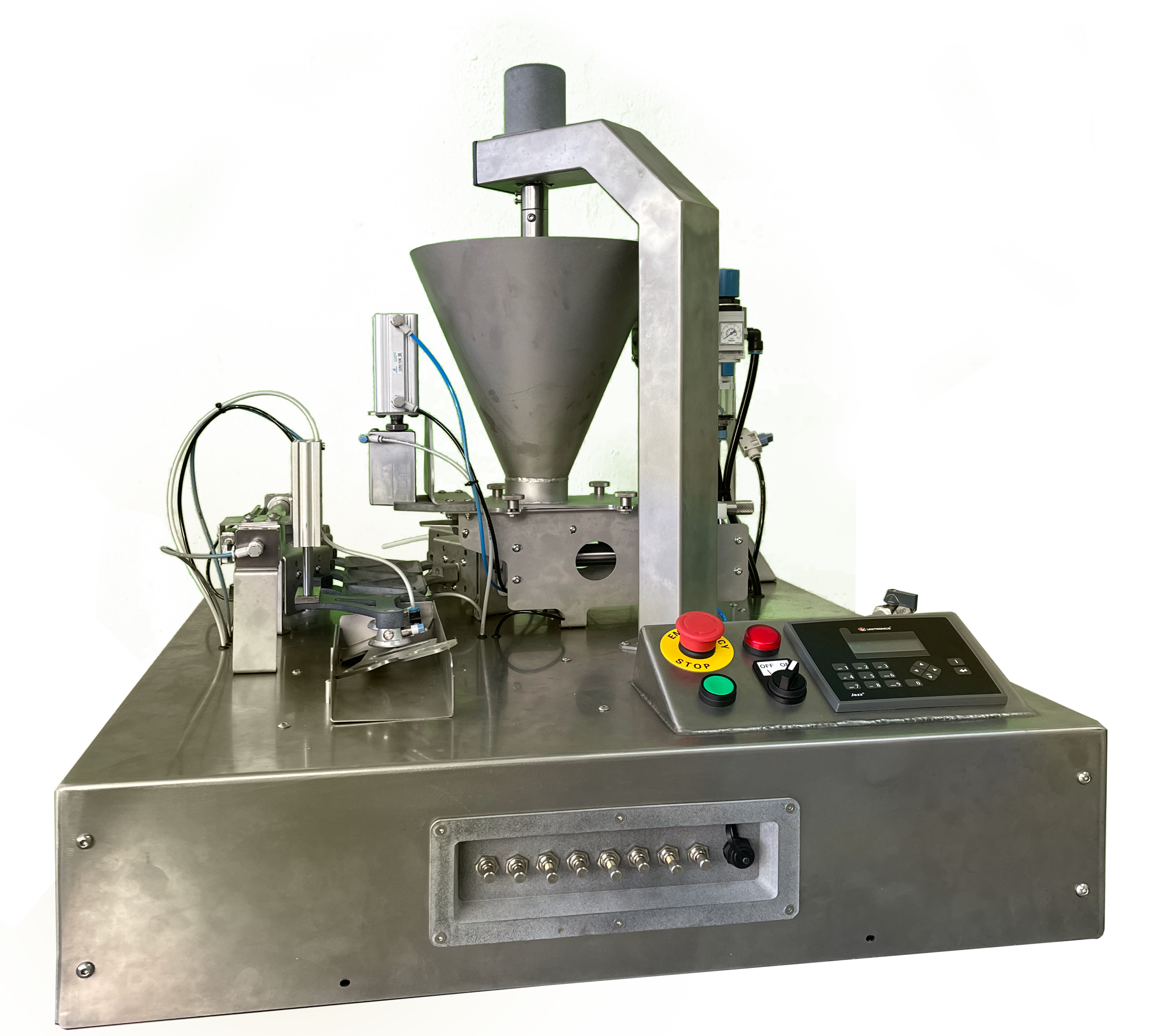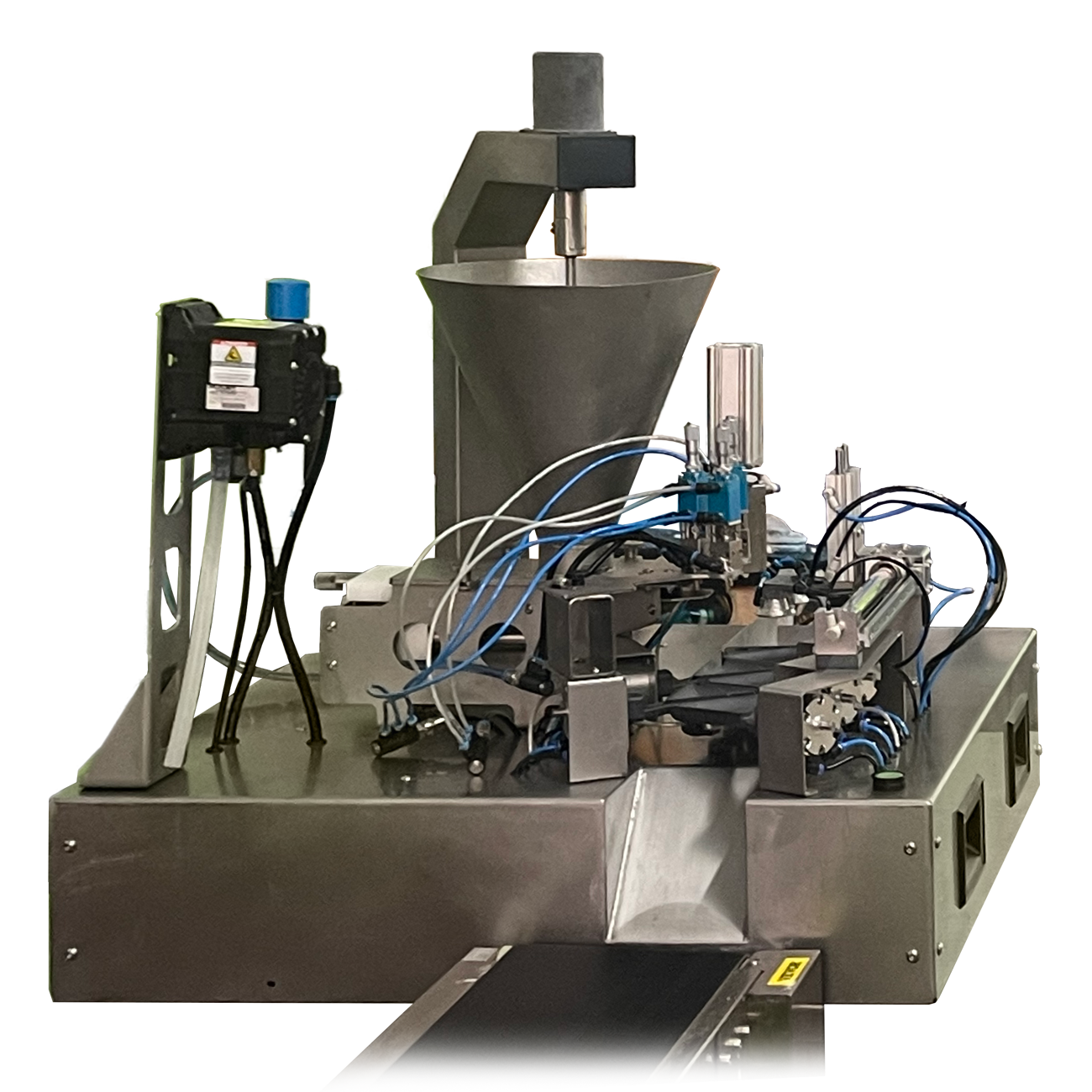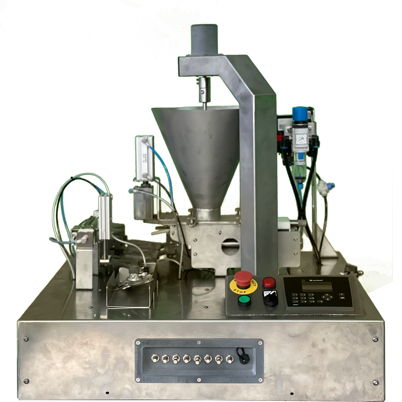 This samosa folding robot automatically transfers the strip of dough placed on the unloading location, deposits the stuffing, places the glue dots and folds it into 3 or 4 successive folds, with ejection of the finished product.